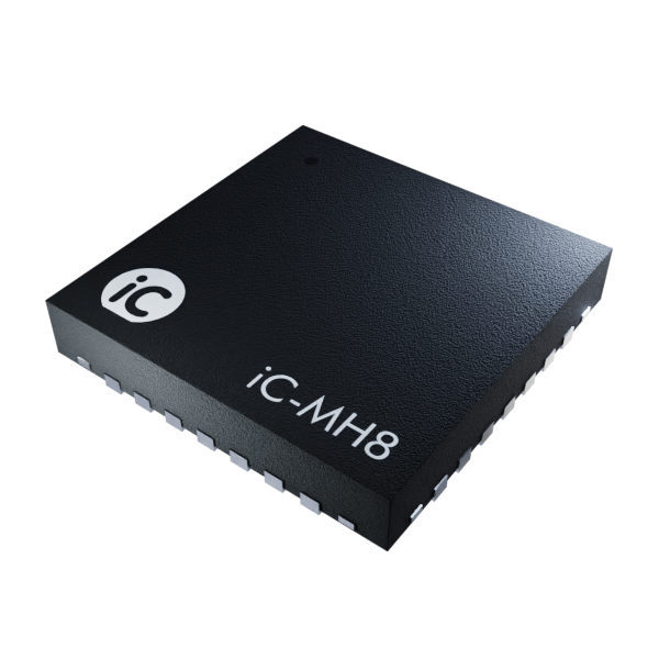 The iC-MH8 is an integrated Hall encoder for sensing the angular position of a diametral magnet.