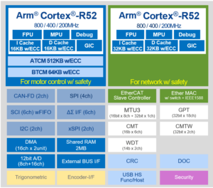 RZ/T2M is an Industry-leading high-performance multi-function MPU that realizes high-speed processing and high precision control required for industrial equipment such as AC servos and Industrial motors. Powered by dual Arm® Cortex®-R52 cores with a maximum frequency of 800MHz for real-time control and embedded with a large tightly coupled memory (576KB) directly connected to the CPU to realize high-performance real-time processing. RZ/T2M enables low latency access by arranging the peripherals for motor control to the LLPP (Low Latency Peripheral Port) that is directly connected to the CPU. RZ/T2M has a multi-protocol encoder interface that supports various absolute encoder protocols such as A-format™, EnDat, and BiSS®. Additionally, RZ/T2M has a 3-port Gigabit Ethernet switch supporting the TSN standard and EtherCAT slave controller. Eventually, Renesas RZ/T2M realizes high speed and highly precise motor control and industrial Ethernet communication such as EtherCAT, PROFINET RT/IRT and EtherNet/IP by single chip.